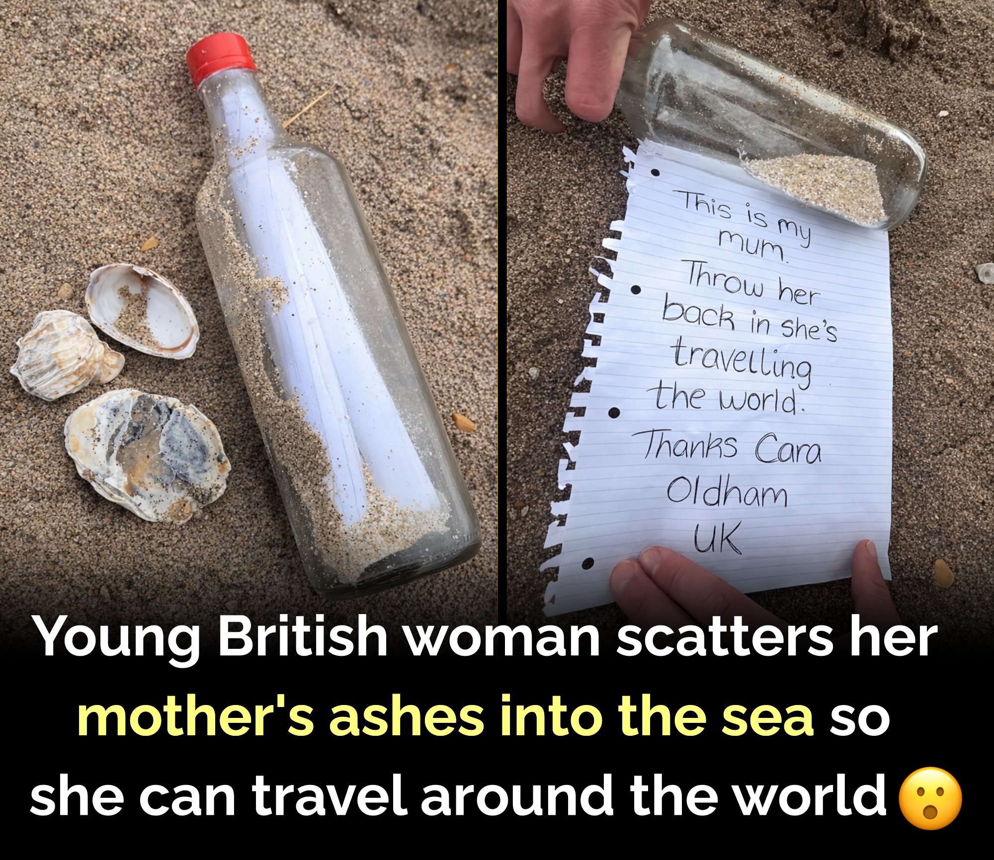 Inside the bottle was a handwritten note that read: “This is my mum. Throw her back — she’s traveling the world. Thanks, Cara. Oldham, UK.” The gesture was simple yet meaningful. For Cara, it was a way of letting her mother continue exploring, even after death — a farewell filled with love rather than finality. 💌