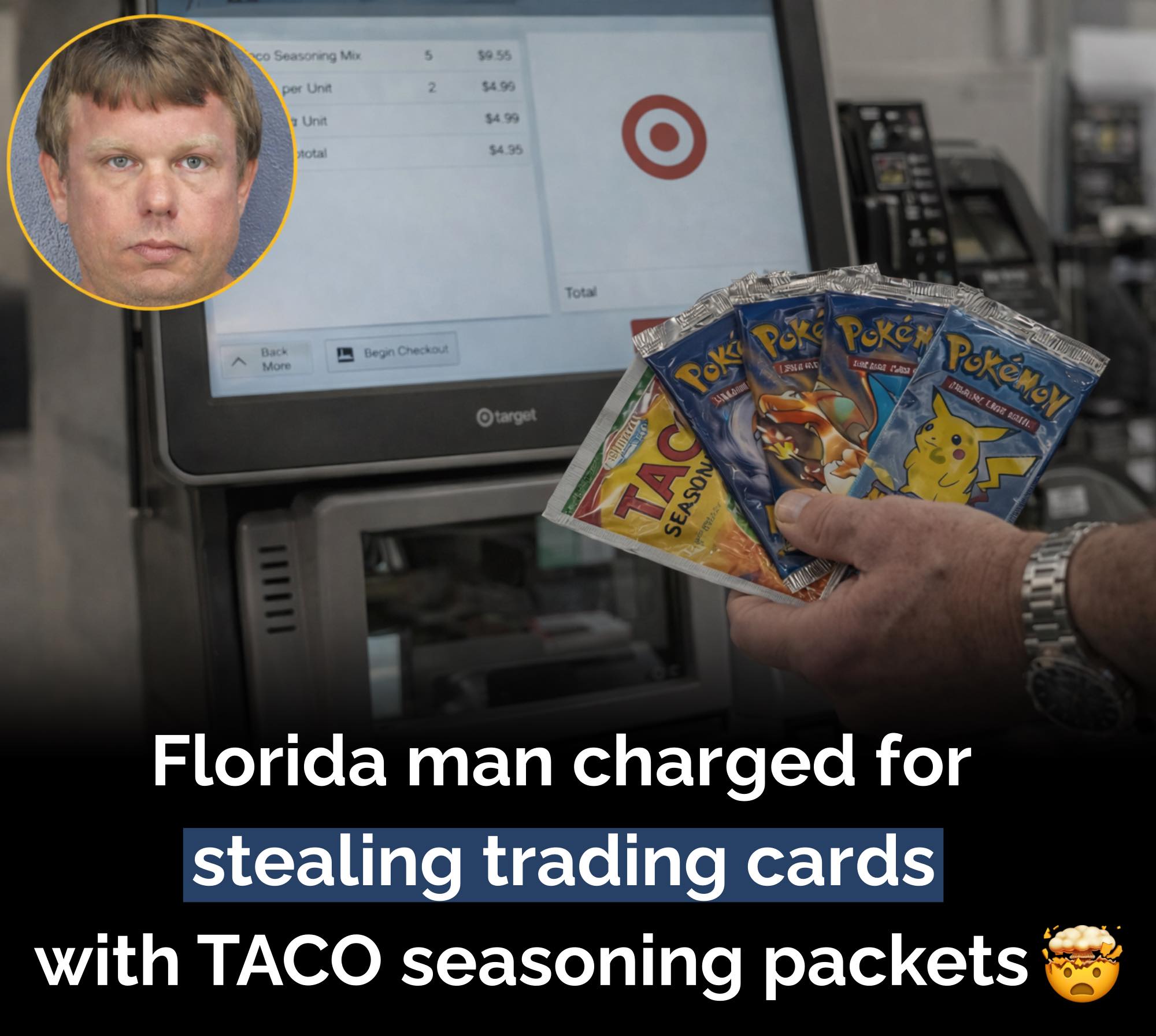According to police reports, Wallis would take large boxes of Pokémon trading cards along with several 99-cent taco seasoning packets. At the self-checkout, he allegedly scanned and paid only for the cheap seasoning while leaving the expensive card boxes unpaid. 🌮📦