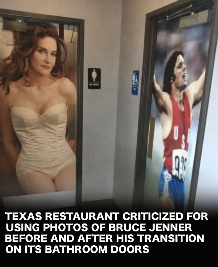 A restroom sign at Dodie’s Place Cajun Bar & Grill has sparked a nationwide debate after photos of the display circulated widely online. The restaurant installed life-sized images on its bathroom doors featuring Caitlyn Jenner on the women’s restroom entrance and a photo of Jenner during her 1976 Olympic victory — when she competed as Bruce Jenner — on the men’s entrance.